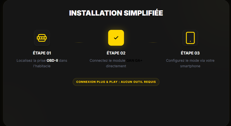 L’installation du GAN GA+ ne nécessite aucune compétence mécanique. Localisez la prise OBD-II sous le tableau de bord. Connectez le module. Téléchargez l’application smartphone et appairez le boîtier via Bluetooth.